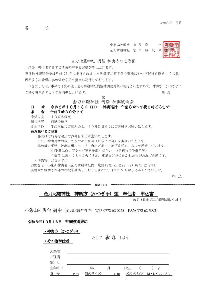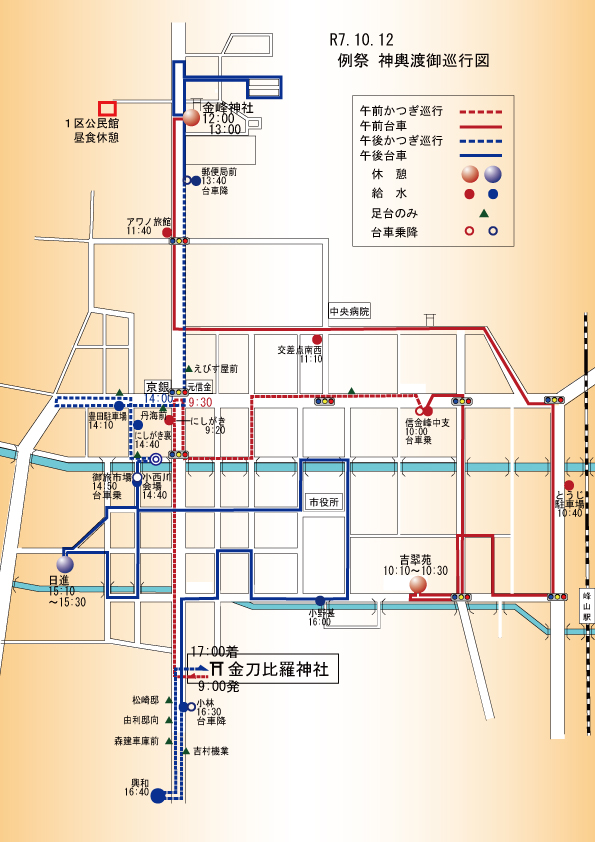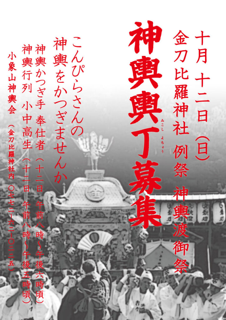 例祭 神輿渡御祭 令和7年 例祭 神輿渡御祭 10月12日(日) 本年の神輿渡御祭は例年通りの内容で復活執行します。神輿は当日午前8時の神幸祭の後、午前9時に社頭を発御し、町内の様子を親しく巡行になります。 正午頃に御旅所金峰神社で途上祭を斎行し、午後5時頃の還幸となります。神 輿 他に例のない程の大神輿で、最少50名の舁(カ)き手がないとあがらず、人員確保の困難から長年台車での巡行でしたが、平成23年御鎮座二百年祭より奉舁巡行(かつぎ巡行)を行っています。 また、昭和2年の震災で失われ、二百年祭で復元された「吹貫」が行列の先頭を進みます。 神輿行列渡御順路 午前 9時 社頭発御 12時 途上祭 金峰神社前 午後 5時 社頭還御 神輿輿丁(みこしよちょう)かつぎ手、神輿行列奉仕員(小中高生他)を募集しています。 神輿方(かつぎ手)、行列奉仕者、その他奉仕者 募集要項 申込書 上に戻る 令和7年 秋祭り巡行・総披露10 月11日 (土) ・12 日 (日) 2日間 ・10月11日(土)宵宮・奉納総披露 金刀比羅神社境内 午後6時頃より 各山車屋台奉納披露・10月12日(日)秋祭り・総披露 小西川添い特設会場(御旅区内) 午後1時頃より 各山車屋台奉納披露峰山伝統芸能振興会 ・10月12日(土)宵宮・総披露・奉納 金刀比羅神社境内午後6時20分頃 峰山よさこい連午後6時40分頃 杉若太鼓午後7時00分頃 峰山民踊子供踊り午後7時20分頃 杉若神楽・10月13日(日)秋祭り・総披露・奉納 金刀出羅神社境内午後O時50分頃 峰山民踊子供踊り午後1時10分頃 峰山よさこい連午後1時30分頃 杉若神楽峰山伝統芸能振興会